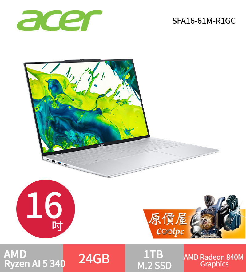 Acer Swift Air /Ryzen AI 5 340/24G/1T/16吋/銀 SFA16-61M-R1GC 【極致輕990克】$34900>蝦皮商城