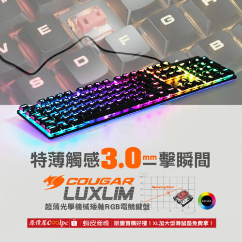 【新品促銷+開箱】特薄觸感3.0mmㄧ擊瞬間!COUGAR LUXLIM 超薄光學機械矮軸 RGB 電競鍵盤新品特惠!
