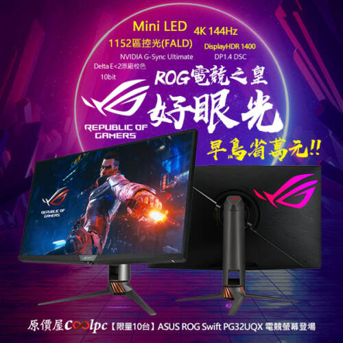 【限量搶購】全球首款 Mini LED、4K HDR、144Hz 稱帝!ASUS ROG Swift PG32UQX 電競螢幕之皇!