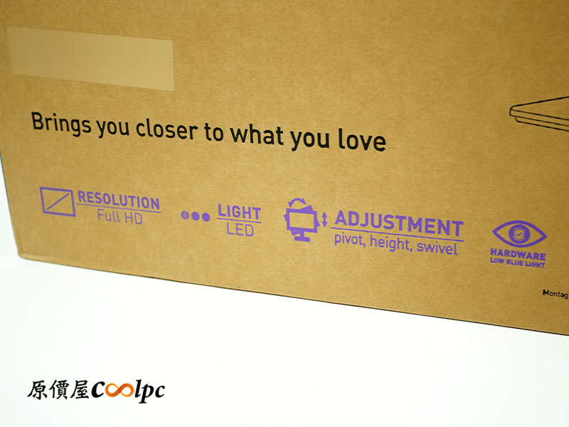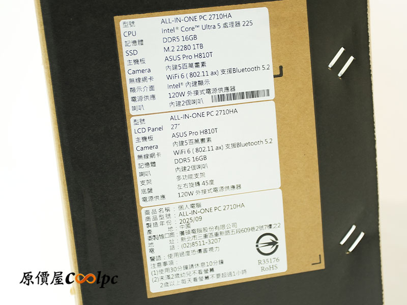 (點小圖放大)外箱用的是環保紙盒包裝,第一眼還真看不出來是台 AI 電腦,不說還以為只是一般的螢幕。細看正面用了可愛的手繪風示意圖把「無邊框設計」和「攝影鏡頭」都標示出來,蠻有辨識度的。下方也清楚列出 FHD 畫質、LED 背光、可調式支架、護眼模式等重點特色。側邊貼紙和背面則寫有完整規格、製造日期和序號資訊,細節一樣沒少。