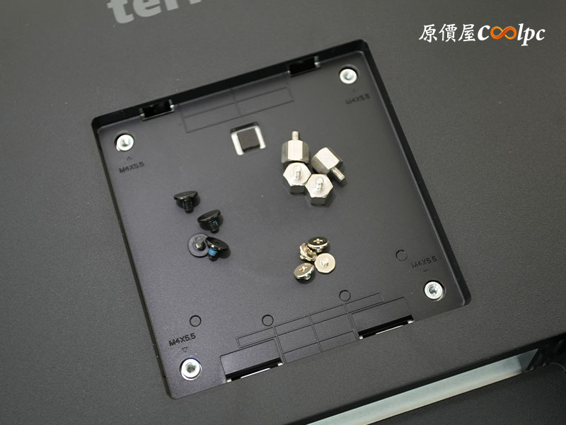 主機背後有支援 VESA 100 x 100mm 規格,所以要壁掛也沒問題。不含底座時整機大概 8.6 公斤,雖然現在大部分的螢幕支架標榜能撐到 9KG,但還是建議大家在安裝前先確認一下載重比較保險。配件裡貼心多附了一組六角螺柱,方便延長、讓你相容更多款支架。銀色那幾顆螺絲則是用來鎖硬碟的,這部分稍晚再帶大家看用在哪裡。