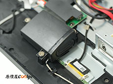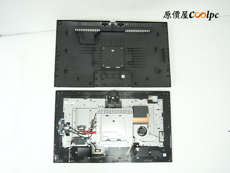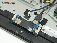 (點小圖放大)一起來看看主機內部,拆開背板後中間的鐵盒子是主機本體,等一下我們接著拆;可以注意到上方視訊鏡頭的機構旁邊有一個開關,要拉開才會觸發啟動;左側 USB 子版從主機連伸出來,下方則是兩顆 3W 的大喇叭,音量和音質都比想像中扎實。