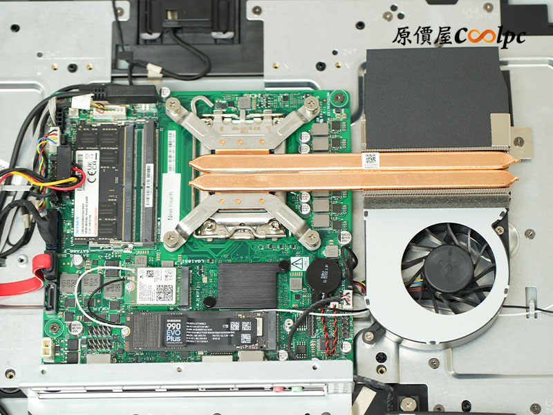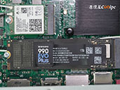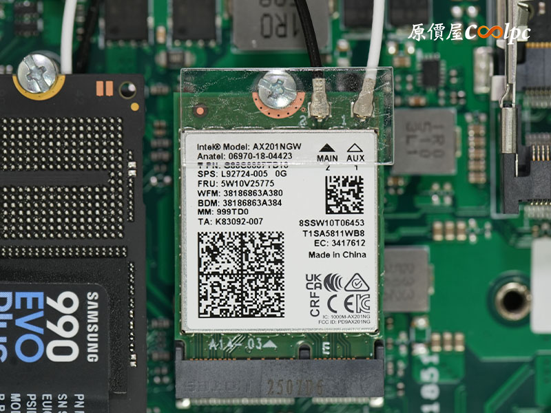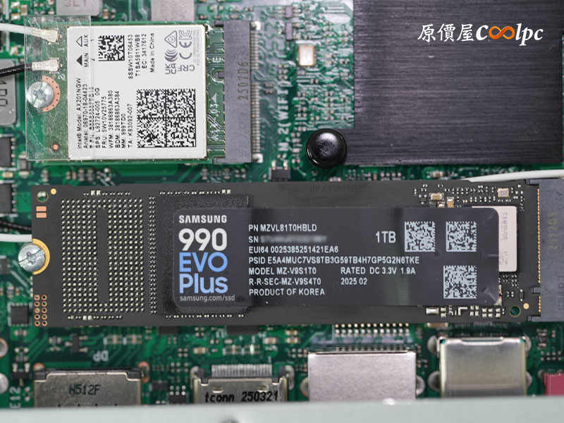 (點小圖放大)再往下拆開主機保護殼,最醒目的就是那由兩根導熱管+鼓風扇組成的大散熱器,下方則是 Intel Core Ultra 5 225(LGA 1851) 處理器,雖然它使用常規的 CPU 腳座,但原廠可沒有說支援其他型號的 CPU,玩家們可別動歪腦進唷 XD!記憶體使用威剛 16G DDR5 5600MHz 記憶體及三星 990 EVO Plus Gne4 1TB M.2 SSD,WIFI 晶片使用 Intel AX201NGW,支援 WIFI-6、藍牙 5.2 傳輸,整體用料相當扎實,看得出廠商真的有用心。