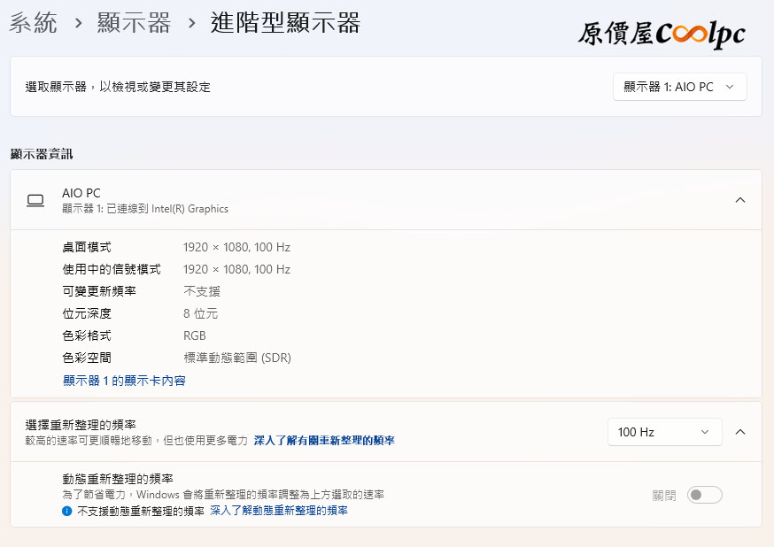 顯示器資訊顯示 1920 x 1080@100Hz。