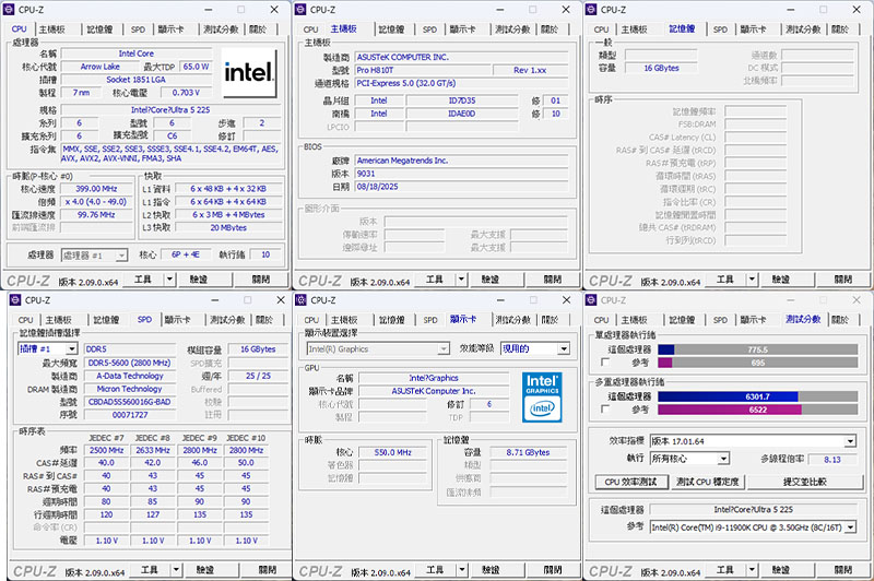 CPU-Z 顯示 CPU 搭載 Intel Core Ultra 5 225 處理器(6P+4E核,10緒),內顯為 Intel Graphics 晶片。