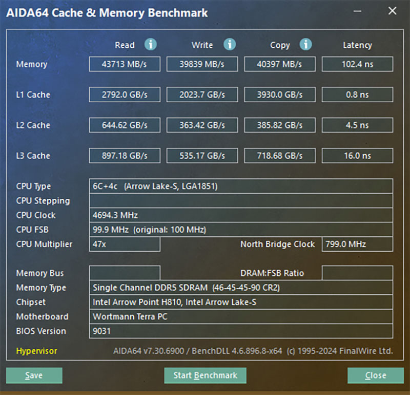 AIDA64 Cache & Benchmark 分數,Read 43713 MB/s、Write 39839 MB/s、Copy 40397 MB/s、Latency 102.4 ns。