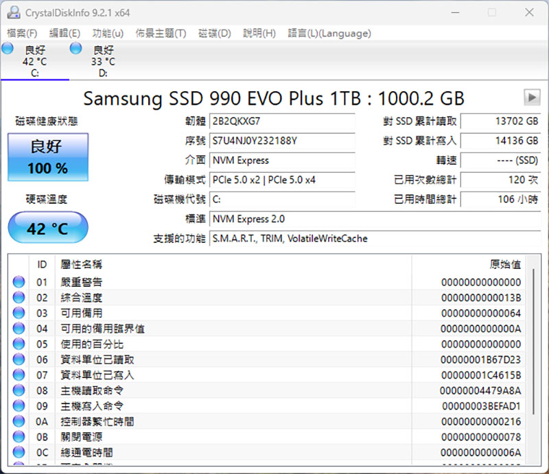 CrystalDiskinfo SSD監控軟體,內建三星 990 EVO Plus Gne4 1TB,支援 S.M.A.R.T、TRIM、VolatileWriteCache 功能。