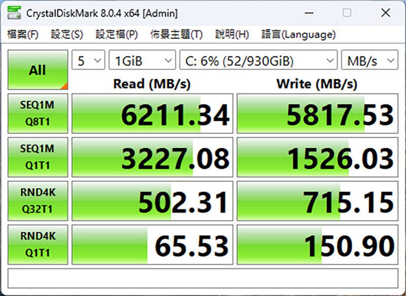 CrystalDiskMark 硬碟速度測試,最高隨機讀寫速度為 6211.34/5817.53 MB/s。