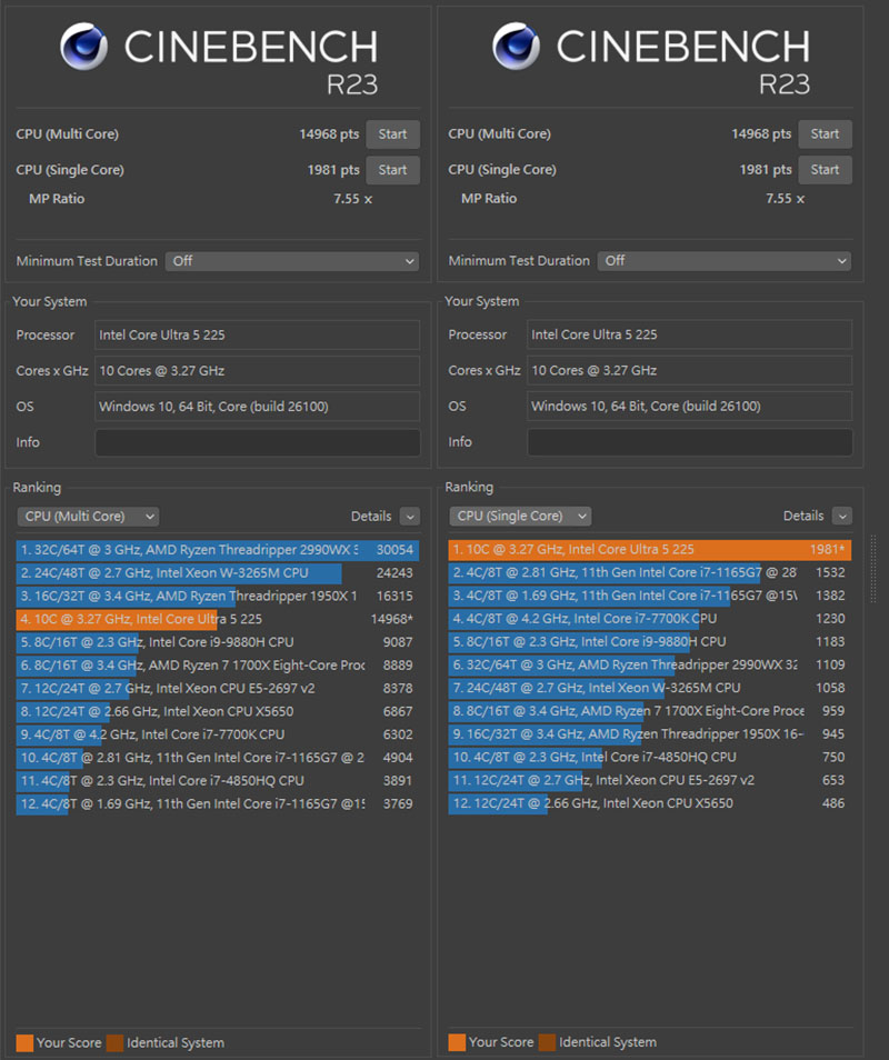 Cinebench R23 測試分數,CPU單核心 1981 pts、CPU多核心 14968 pts。