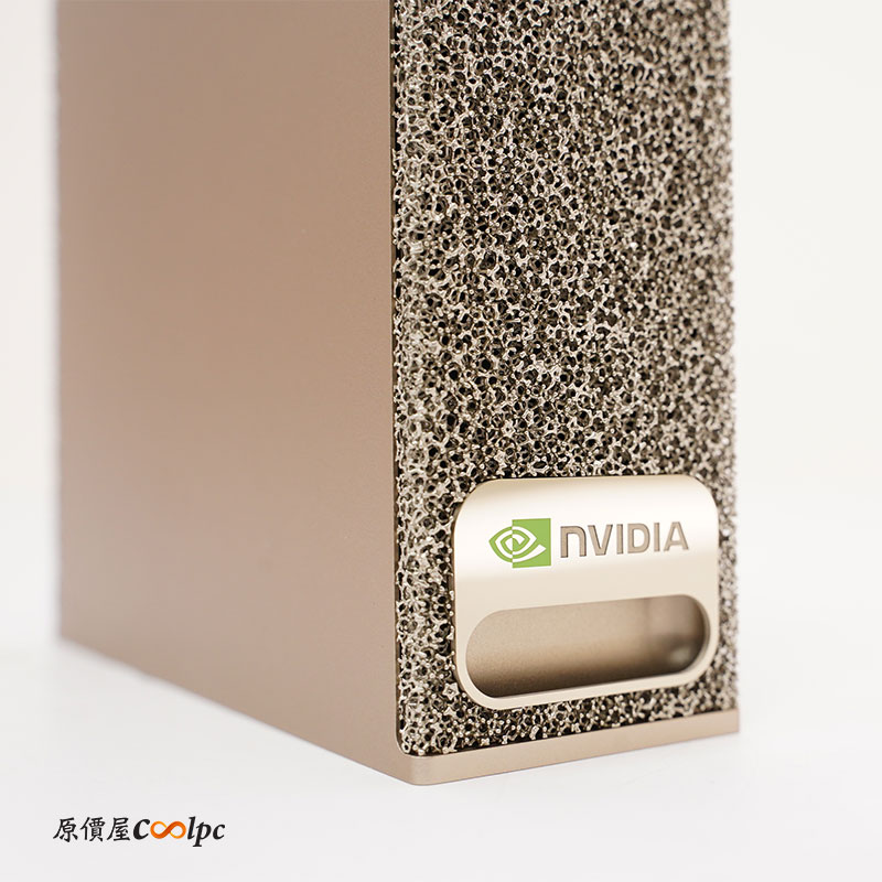 完全不割手的前面板發泡金屬(Metal Foam)前衛的造型設計!除了耐看之外,多個細小開孔可以讓正常氣流進入,讓機器有正常的空氣流動,底下還有一塊 NVIDIA 立體銘牌!