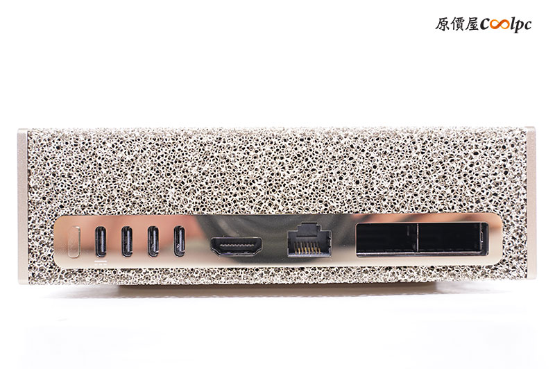 背面一樣有大面積的發泡金屬造型,底下 I/O 有開機按鈕、Type-C 供電插槽、3 x USB3.2 Gen2x2 Type-C、HDMI 2.1、10GbE 網路埠、2 x QSFP 介面。