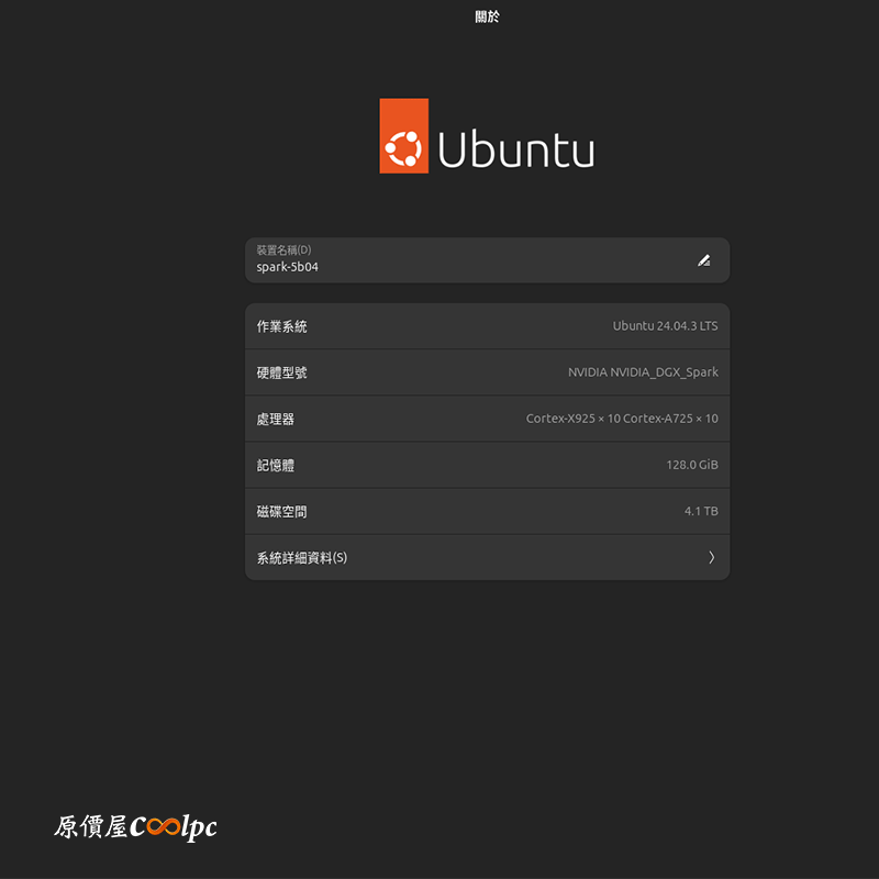 創始版香檳金金屬機身外觀設計,非常好看!尺寸為 150 mm 長 x 150 mm 寬 x 50.5 mm 高,重量 1.2 公斤,DGX Spark 使用的規格 CPU 是聯發科 Arm Cortex-X925 和 Cortex-A725 CPU,GPU 是 NVIDIA GB10 Grace Blackwell 架構,內建 128GB LPDDR5x 記憶體(256-bit、273GB/s 頻寬),具備第五代 Tensor 核心、第四代 RT 核心,網卡採用 ConnectX-7 Smart NIC @ 200 Gbps,可以讓兩台主機串一起作業,還有 Wi-Fi 7 & 藍芽 5.4 技術,還有內建 NVIDIA DGX OS(Ubuntu Linux),想要知道它的實際算力可以參考(官方網站)