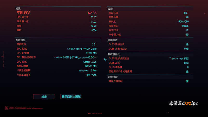 小編自己純好奇能不能跑遊戲,看到國外論壇有教學(點我查看),試了一下還真的可以跑,而且還能開 DLSS 4 多幀生成技術,畢竟是 Blackwell 架構晶片沒道理不行呀!以上純屬實驗精神,真的要打遊戲還是建議買有獨立顯卡的桌上型電腦。