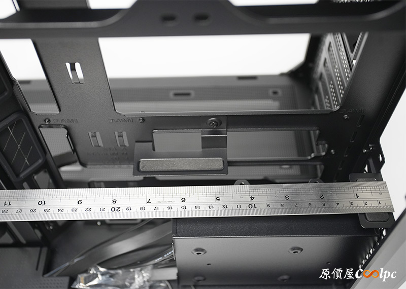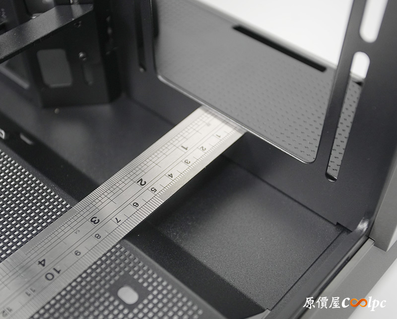 中間是電源供應器安裝位置,長度限制180mm,已經能容納大多數的電源款式,而且前面也還有空間做線材管理,電源也能透過右側板的開孔直接獲得新鮮空氣,就連電源散熱都有兼顧。
