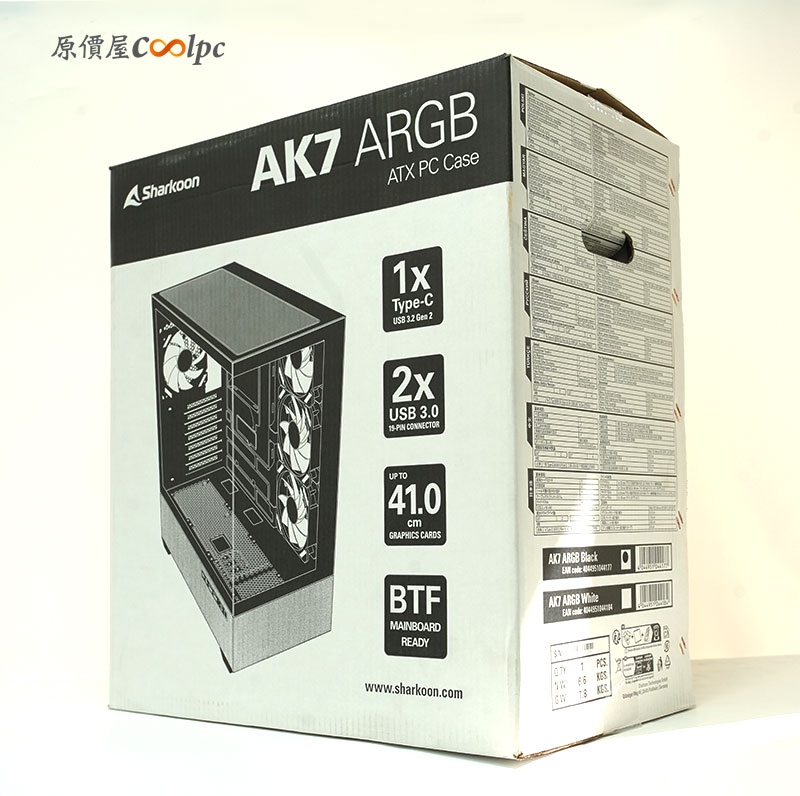 「Sharkoon AK7 ARGB」給人的感覺,就是真正把海景房做到位的機殼。雙側強化玻璃打造出的全景視野,配上無 A 柱的極致開放式視角,讓整台主機彷彿展示櫥窗般毫無遮擋地呈現所有細節。無論是水冷管線、顯卡造型、主機板燈效,甚至是細微的風扇反射光,都能清楚映照。對於喜歡裝機美學的玩家來說,「AK7 ARGB」根本是一座舞台,讓你的硬體能見度 Max!特別值得一提的是側邊配置的反向扇設計,不只讓冷空氣有效從側面灌入主機、提升內部氣流表現,燈效向外擴散的視覺效果也相當搶眼。加上內建四顆 ARGB PWM 風扇,開箱就有扎實的燈效與散熱雙重體驗,對於想要省心裝機的玩家,是相當有感的優勢喔。另外硬體相容性方面,「AK7 ARGB」同樣展現出誠意。可支援最長 410mm 的顯示卡、 170mm 的塔散高度、以及最長 235mm 的電源供應器,對市面上主流與高階硬體皆非常友善。主機板部分也支援最大 ATX,甚至是近年流行的背插主機板,也能完美安裝,整體可玩性極高。從設計、擴充到實際使用的角度來看,「AK7 ARGB」的完成度可說是近年同價位海景房機殼裡難得的強勢作品。除了具備漂亮的純玻璃視覺與高透明度展示性,它還同時兼顧散熱、燈效、線材隱藏性與相容度。再加上底部布質材質點綴、整體造型簡潔俐落等設計加分項,可以看出 Sharkoon 是把這款定位在外觀與實用兼具的主流旗艦機殼!而在市場方面,一般雙玻璃全景機殼若具備多風扇預裝、反葉扇設計、背插主機板支援等特色,價格往往突破 3000 元,但「AK7 ARGB」的黑色售價僅 $1990、白色版本 $2090,價格差距非常有感。CP 值幾乎是同級產品中最具吸引力之一!而目前我們原價屋也已經上架開賣多時,有興趣的玩家朋友也歡迎你來到我們原價屋來詢問或下單喔~