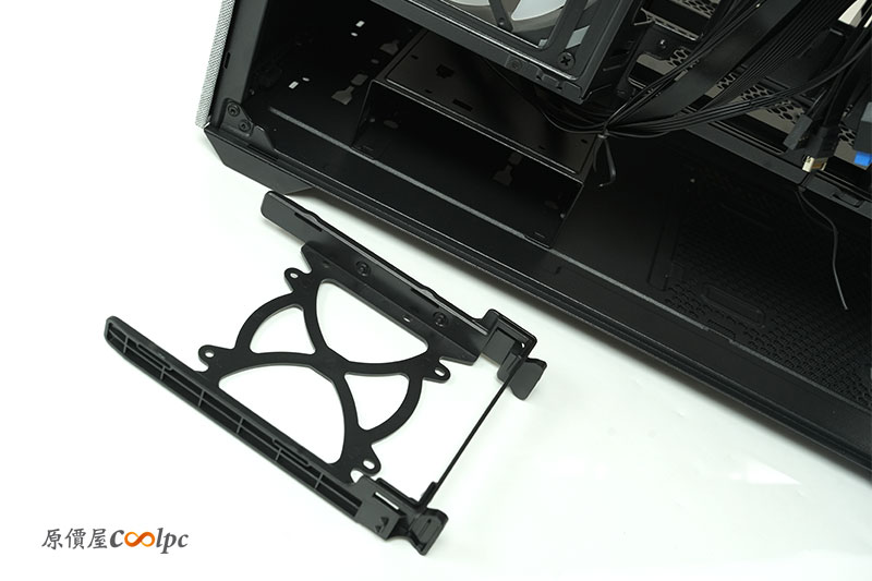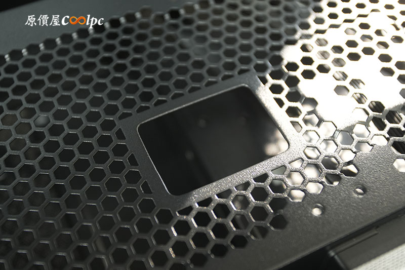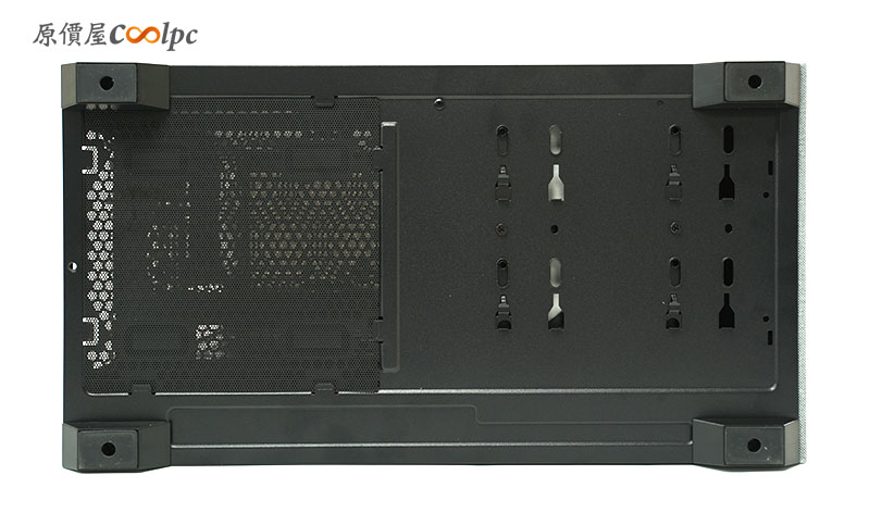 底部一樣擁有濾網,可抽取式設計,方便維護與清潔。一旁則是電源艙硬碟支架的移動孔位。