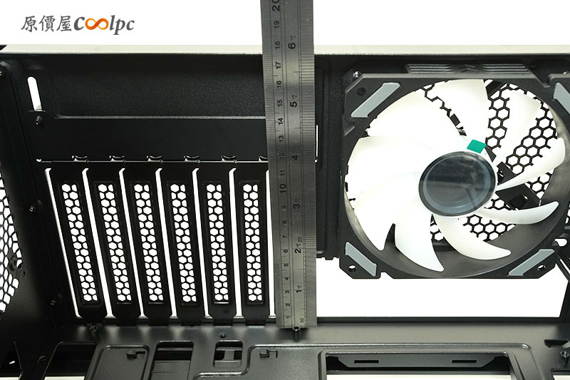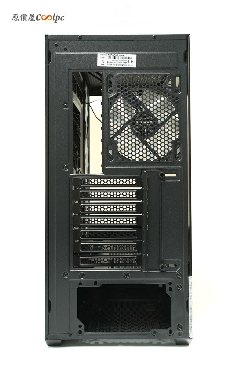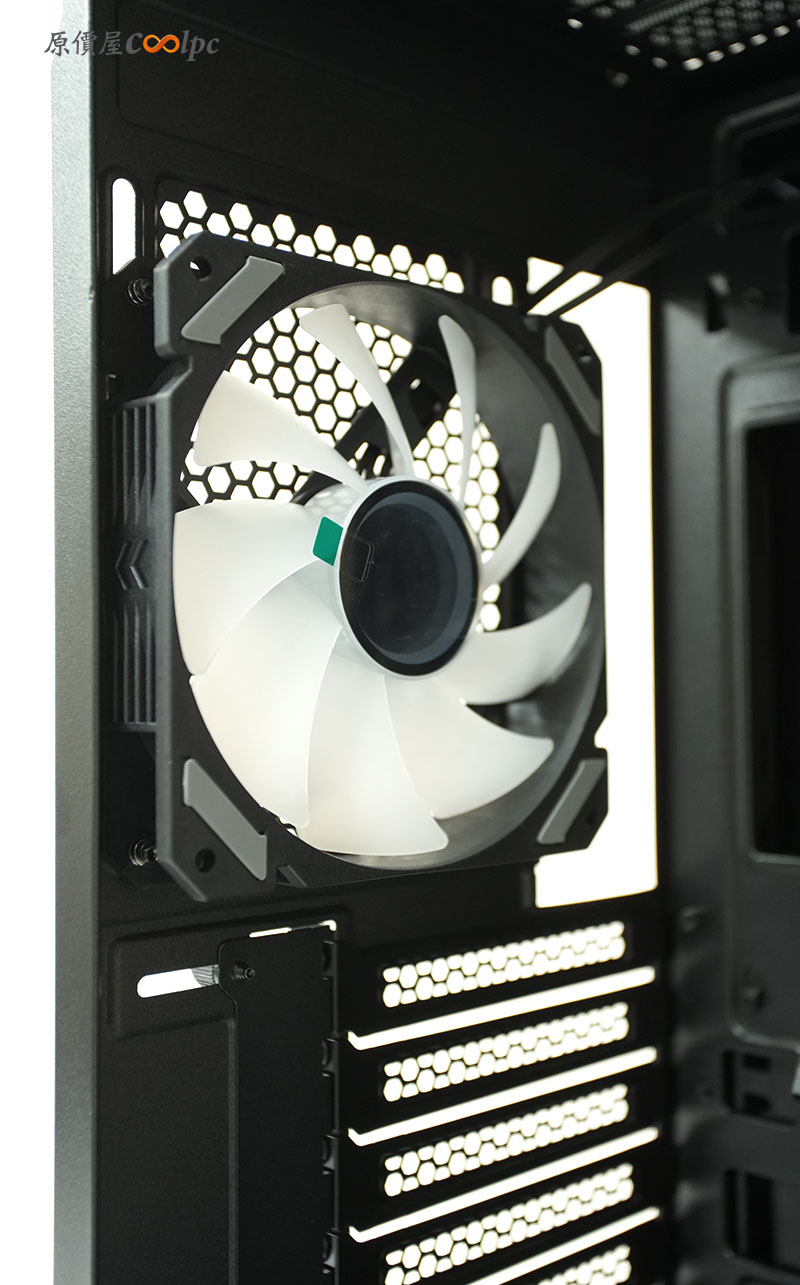 機殼後端。採用標準的 ATX 直立配置,這邊也標配一顆 120mm ARGB 風扇,擁有 7 條 Slot 設計。