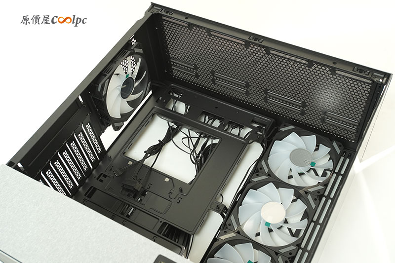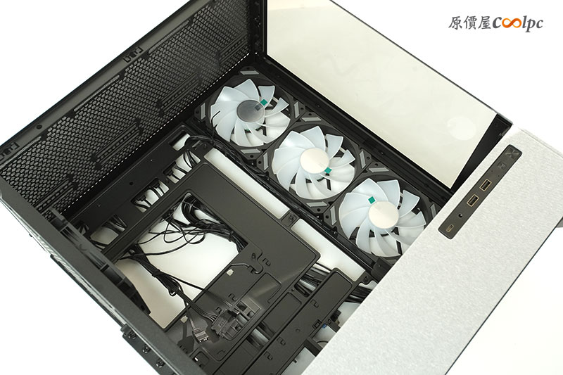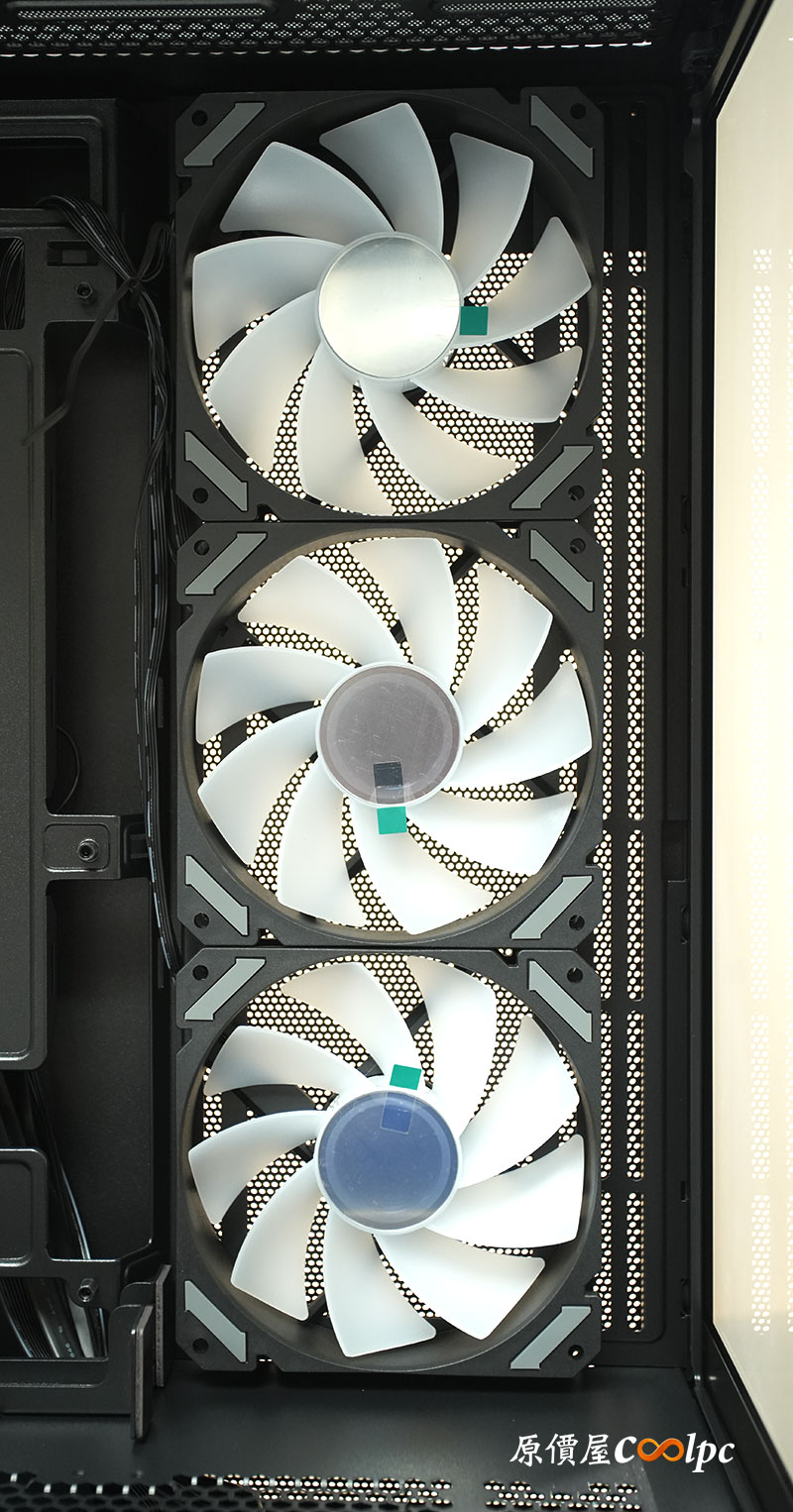 側邊的 3 顆風扇位置,也能自行換裝水冷排的設備。讓你能做雙水冷排搭配,一個 360mm+一個 280mm 的水冷排同時運作。