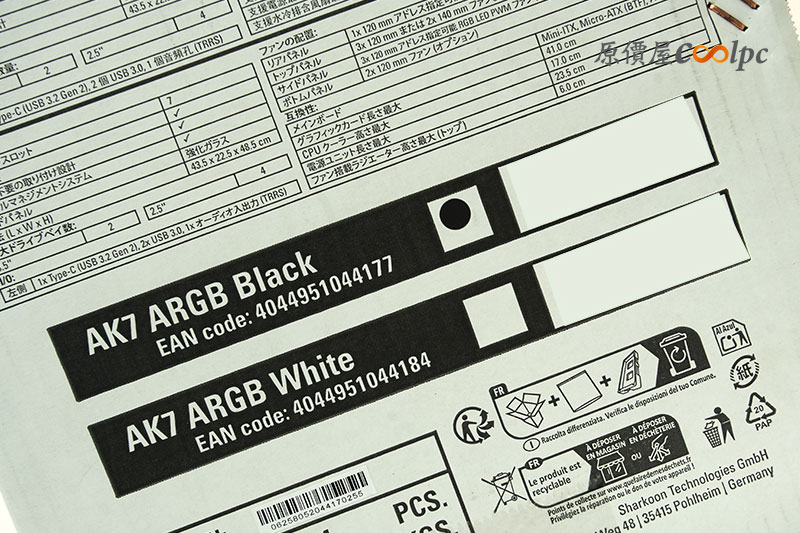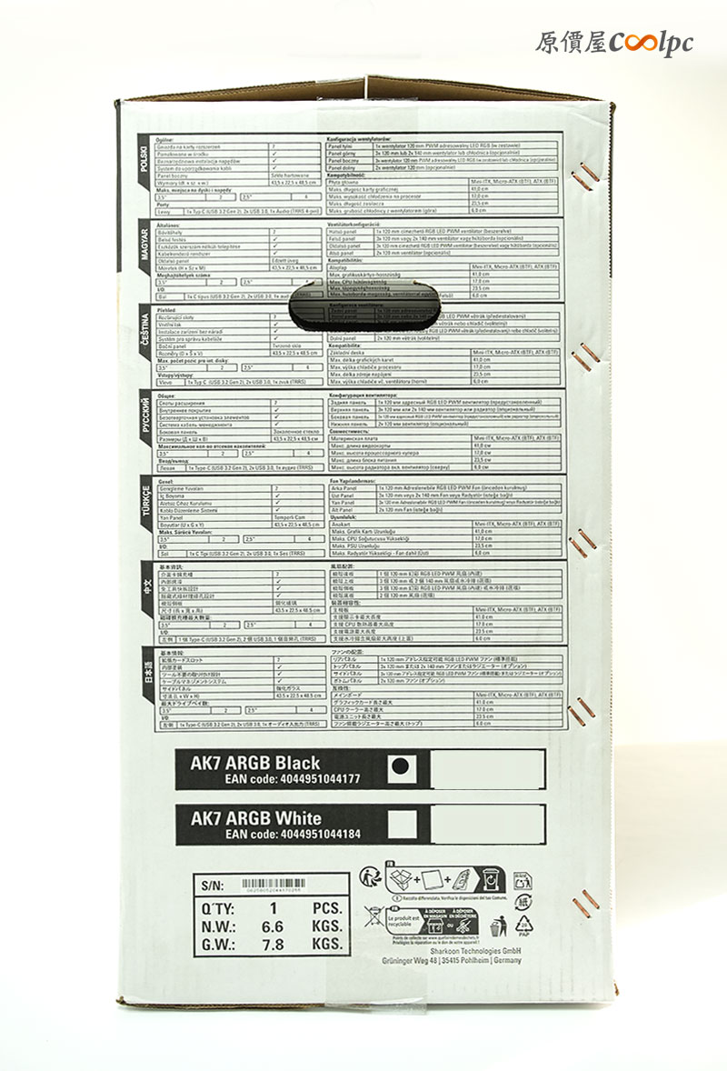 AK7 ARGB 的外箱採用標準工業風設計,印有機殼外觀示意圖與 Sharkoon LOGO,整體包裝紮實厚重,能保護內部玻璃面板。
