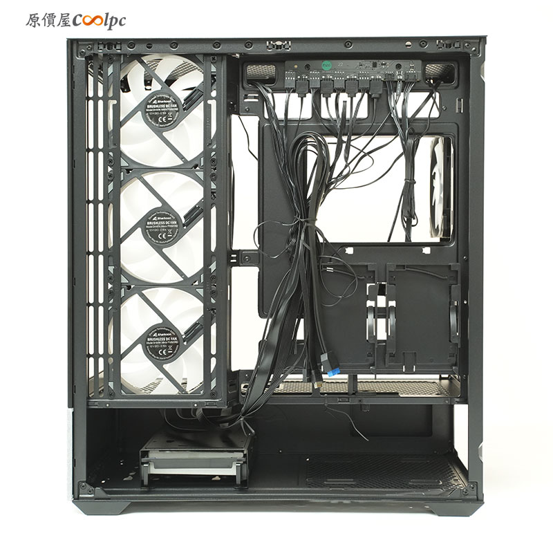 卸下後面側板後,背板的內部結構。也預留大面積的走線槽,背插或傳統線材都能保持整潔。
