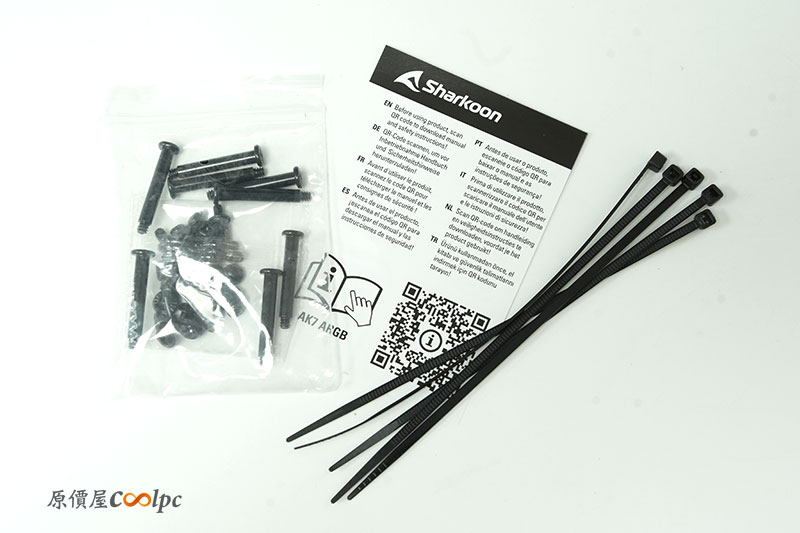 也附有額外的螺絲與配件包,內容包含束線帶、主板螺絲、HDD 螺絲、擋板螺絲等裝機所需所有零件。也有一份簡易的說明手冊。