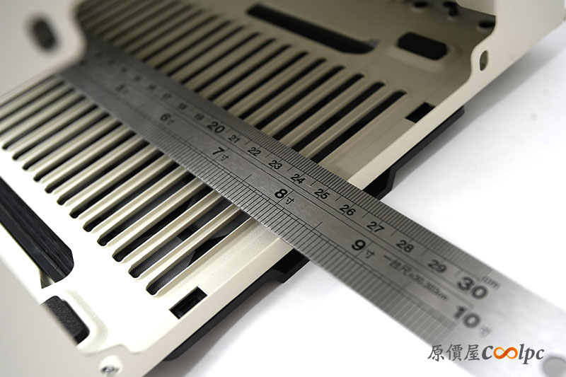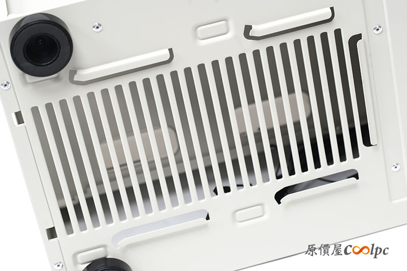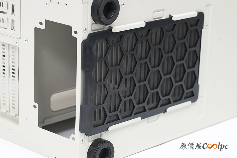 機殼底座,電源艙的下方也有長形的散熱孔位設計,也附有一組可拆卸的濾網。