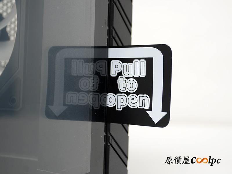 側邊強化玻璃採用方便的卡榫式設計,不用螺絲起子,直接從邊緣掰開就能輕鬆開啟;曜越還很貼心地在上方貼了一塊指示貼紙,看完直接撕掉就好,不用擔心影響美觀。