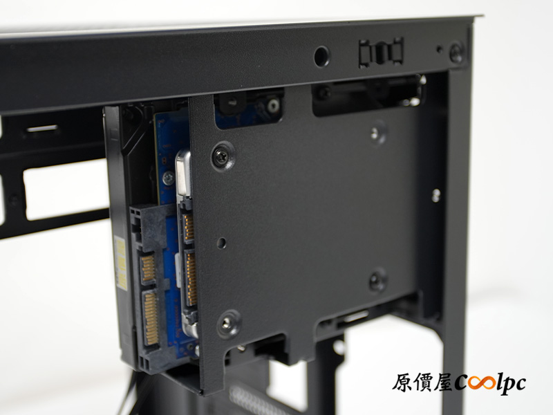 硬碟支架可以安裝兩個 3.5 吋 HDD,或是 3.5 吋加上 2.5 吋 SSD 各一顆的混搭組合都沒問題。