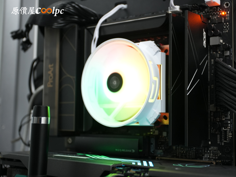 外型與大小基本上跟全銅版完全一致,不過一般版的配色改為全黑,視覺上更顯內斂,這也是小編偏好的風格。風扇部分同樣具備 RGB 燈效,但扇框也同步改成了黑色,維持整體的統一感。