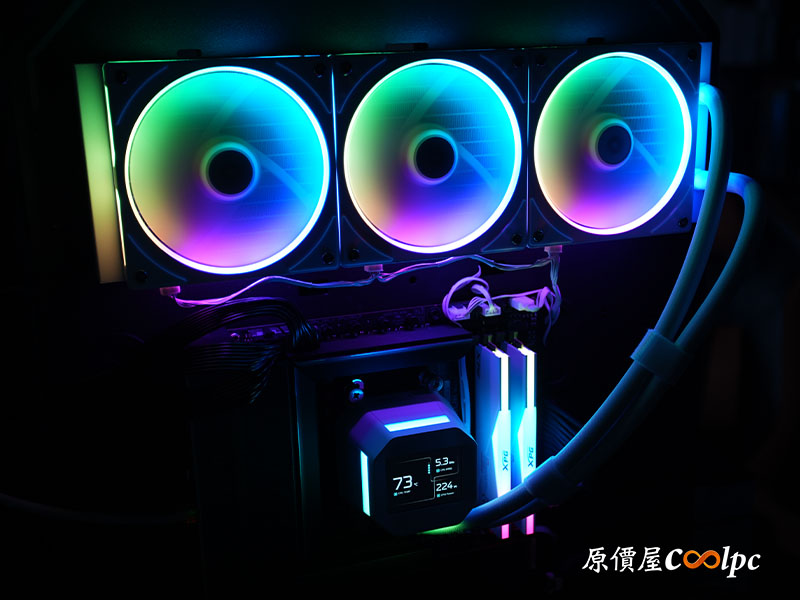 實際上機效果也真的不錯!你看 ARGB 光圈泛光出去的質感,小編還只是裝在測試平台上,如果是鋼化玻璃機殼那效果一定更讚!