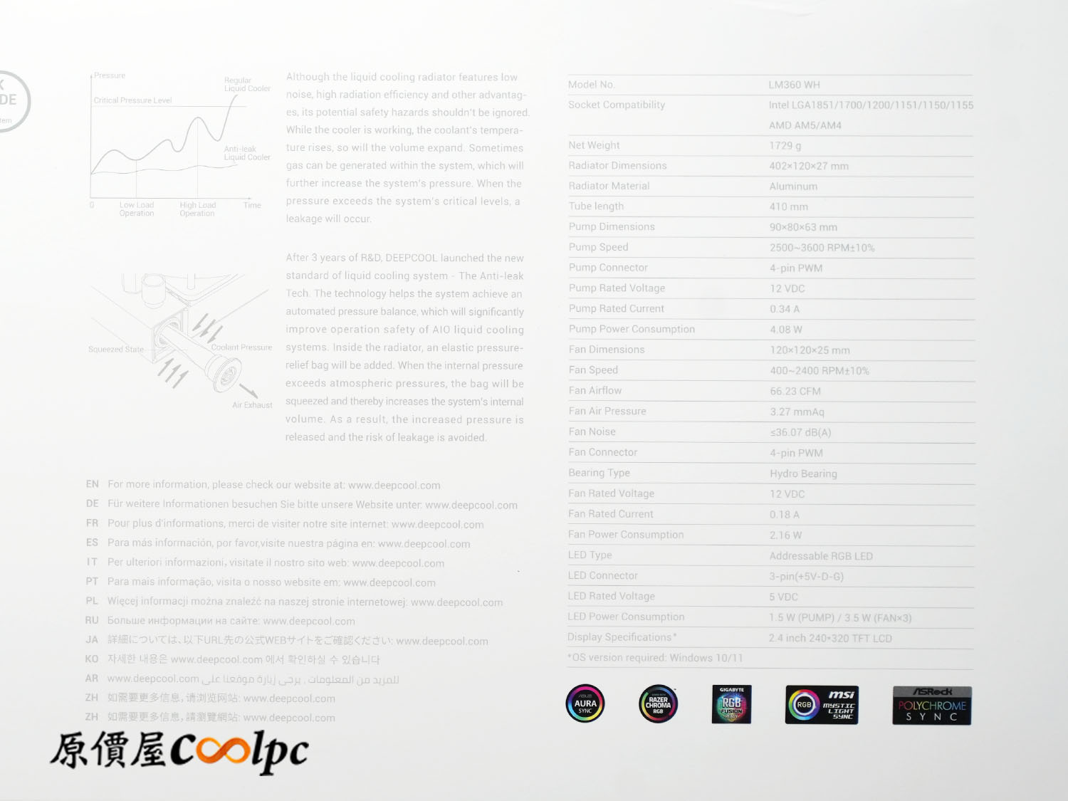 @2025/10/03 ,11:42剛剛裝水冷的時候你偷看了對吧?水冷發展從無光到白光,再來有 ARGB 幻彩燈光,現在又有 LCD 顯示器…花樣越來越多!九州風神在所有元素具備的情況下,還能做出 C/P 價值!這回原價屋帶來 DeepCool LM360 WH 一體式水冷散熱器,2.4 吋 IPS 顯示器冷頭搶盡鋒頭,支援硬體監控與自訂 JPEG/PNG 圖片或 GIF/MP4 影片!搭配預裝幻彩星環三風扇,一條線便可串接完成,且燈光支援各大廠燈光同步軟體,DIY 組裝方便又整潔!更特別的是獨特的動態平衡卸壓(Anti-Leak)技術,內部壓力透過閥門控制,有效降低漏液風險並延長壽命。可支援主流 Intel LGA 1851/1700/1200/1151/1150/1155 及 AMD AM5/AM4 平台,水冷本體 5 年保固,LCD 螢幕 3 年保固,DeepCool LM360 黑/白雙色兩款都賣 NT$3690,在 DIY 市場算滿有競爭力了。有興趣的朋友可往下參考 DeepCool LM360 WH(白) 水冷散熱器的開箱。