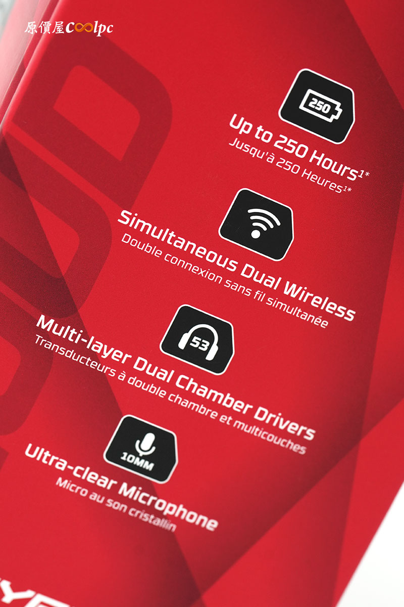 左下角有產品特色一覽。清楚列出重點規格,包含 250 小時續航、招牌雙腔體設計、無線連線優勢等,讓你在開箱前就知道這副耳機的定位不是入門,而是直衝高階。