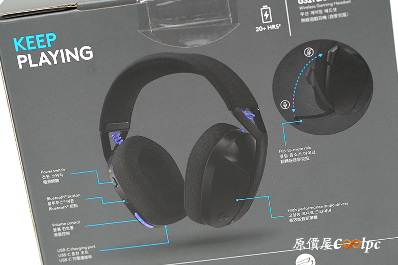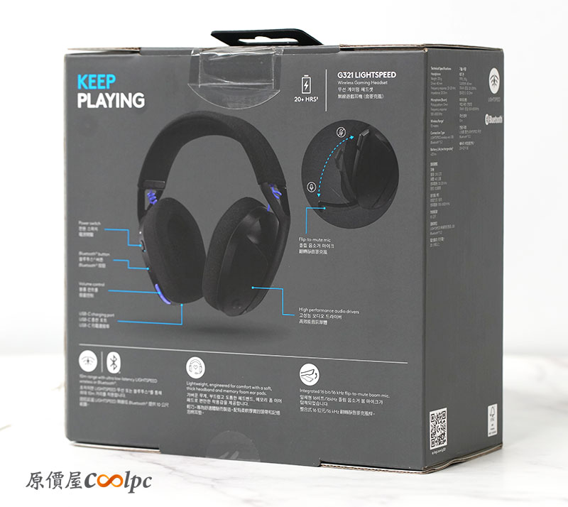 包裝背面則列出了產品的重點特色,包括雙模無線連線、翻轉式麥克風與長效續航等,讓玩家在開箱前就能快速掌握 G321 的核心重點。
