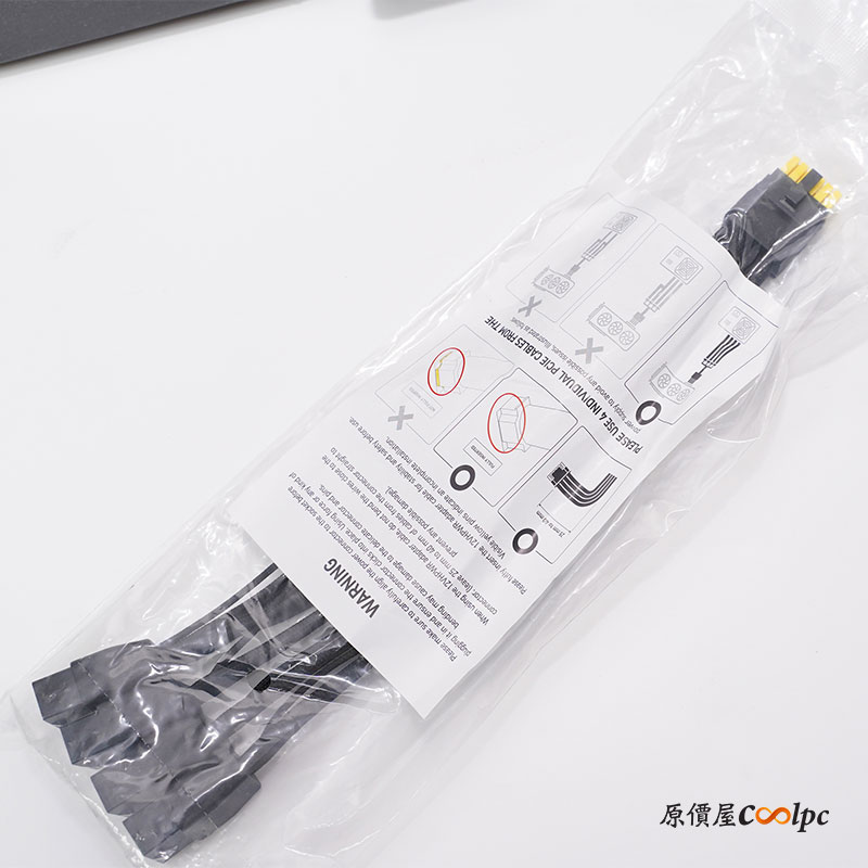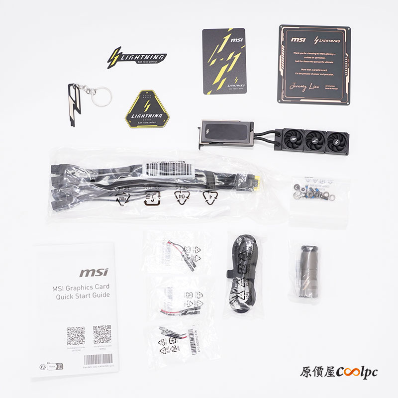 配件盒的部分相當豐富!有 BIOS switch Tool Key Chain 鑰匙圈、兩個 LIGHTNING 磁鐵、NFC CARD(官網介紹連結)、PCB 板感謝卡、迷你 LIGHTNINIG 顯卡磁鐵、USB-C To USB-A、簡易顯卡支撐架、三條 V-Check 線材(測量 GPU 電壓)、16-pin 一對四轉接線材,和一組專屬 LIGHTNING 顯卡垂直支撐架(含 PCIe 延長線)。