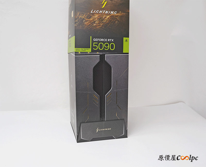 顯卡外盒四面皆有 RTX 5090 LIGHTNING 特色介紹,像是完整 8 吋顯示器、客製化 PCB、全覆蓋冷卻底板、混合式鰭片散熱排、次世代先進幫浦、LIGHTNING 風扇。