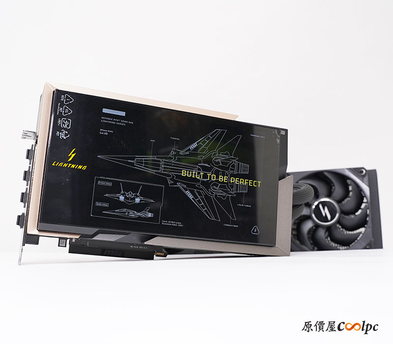 MSI RTX 5090 LIGHTNING Z 浮誇登場!完整 8 吋 顯示卡有貼戰鬥機的膠膜,安裝就定位後就可以把它撕下。