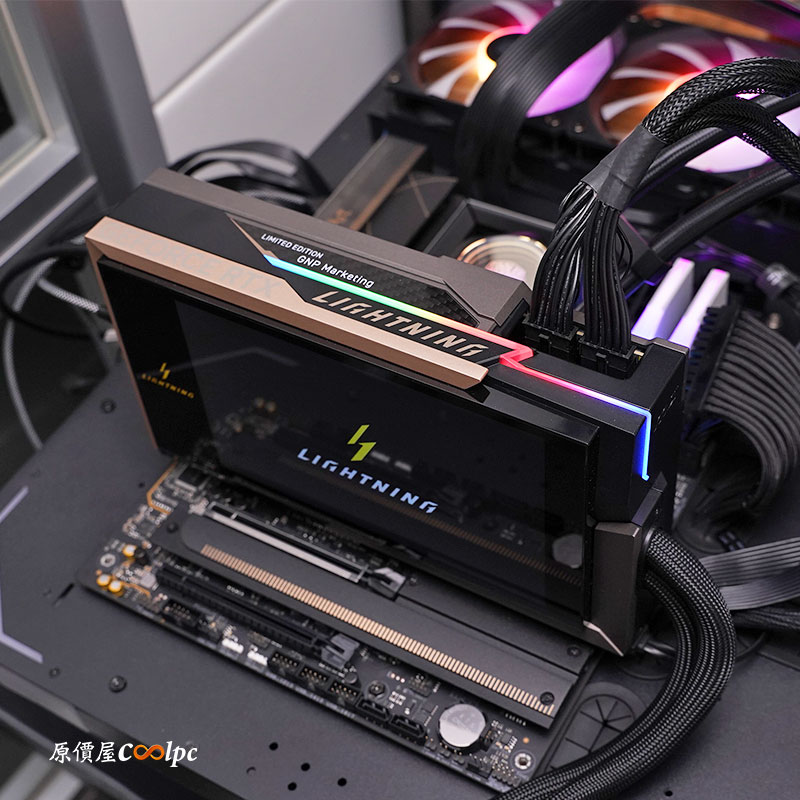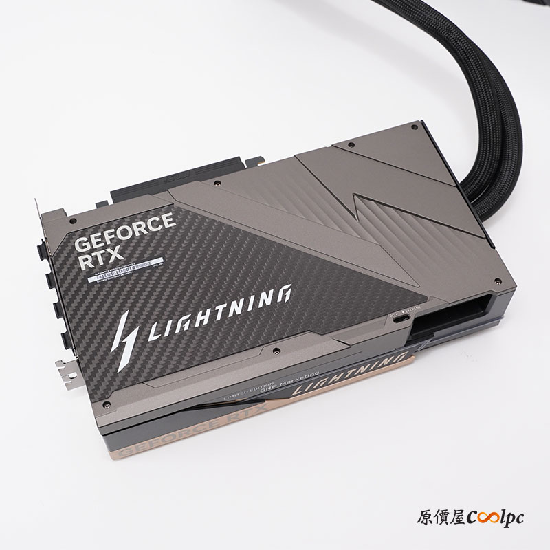 側面可以看到 GEFORCE RTX 香檳金屬邊框,和 LIGHTNING Z 字形柔光條,通電過後會有燈效;中間碳纖維的部分,因為小編拿的是行銷開箱品,所以沒有限量號碼,實際販售會有限量 xxxx/1300 獨立編號,保證獨一無二。供電採用雙 16 Pin 12V-2×6 介面,電源供應器官網建議 1500W+等級。
