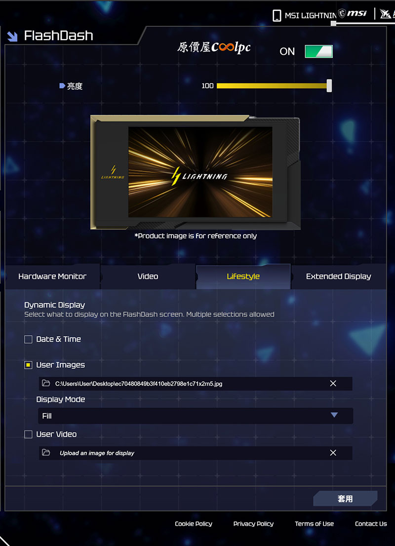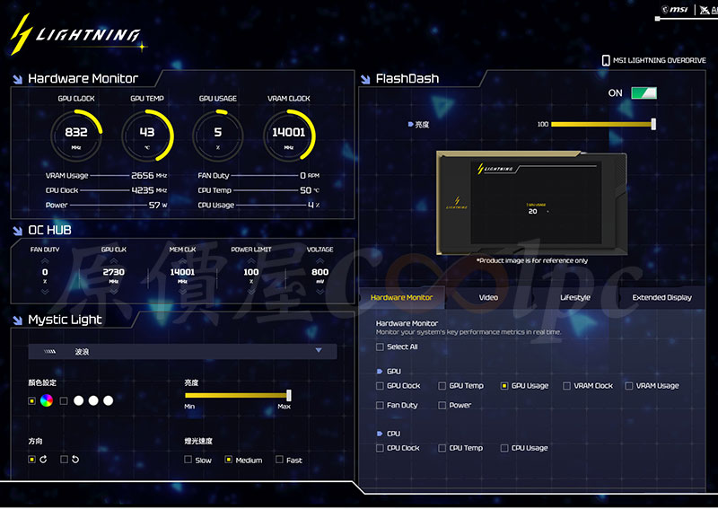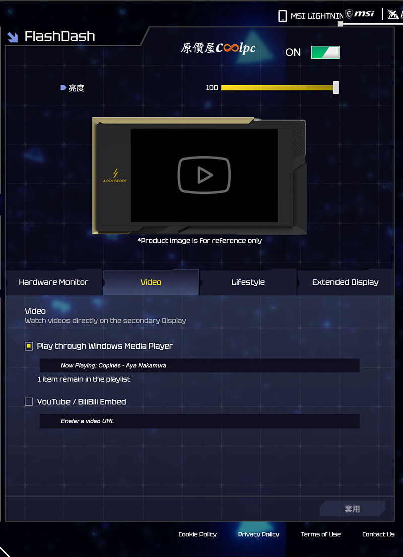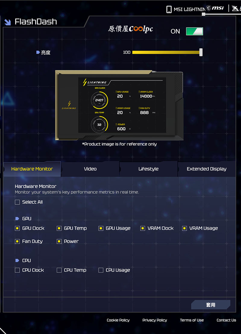 首創透過網頁或手機就能控制的 MSI LIGHTNING HUB 功能,記得先下載套件 (點我前往),接著再到官網下載 MSI USB Display Driver(點我前往),螢幕才會正常顯示顯卡即時狀態、影片、圖片或者是第二螢幕。