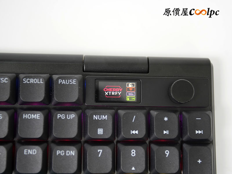 啟動電源後,右上角的 LCD 螢幕就會隨之亮起!透過旋轉和按壓旋鈕,你可以直接控制燈效、亮度、燈效速度、配置切換、音量、媒體切換、鍵盤設定等所有功能。搭配鍵盤上的 FN 快捷鍵,你幾乎不用再開啟軟體,就能掌握鍵盤 90% 以上的控制權!