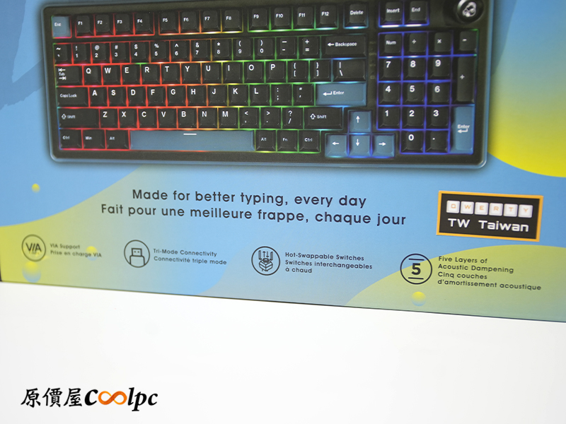 這次開箱的主角是空間運用最平衡的 98% 配列,如果更追求桌面操作空間,也有 FPS 玩家最愛的 75% 版本可以選擇。外盒包裝走的是充滿活力的年輕塗鴉風,下方一次排開的功能標示,像是專業玩家必備的 VIA 軟體支援、超方便的無線三模、增加客製化玩法的軸體熱插拔,以及讓敲擊聲更純淨的五層聲學降噪,還有台灣囝仔必備的中文鍵帽!