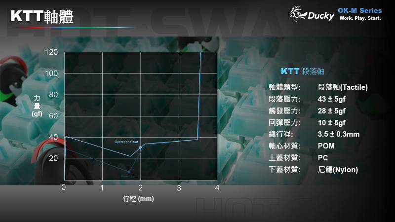 軸體採用 KTT 段落軸,段落壓力是 43±5gf,觸發壓力 28±5gf,回彈 10±5gf,總形程 3.5±0.3mm,POM 軸心材質,手感上是比較像粒粒分明的顆粒。