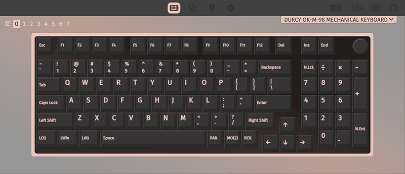 左上角可以看到有 0 到 7 層可以自由設置,原廠預設的快捷鍵通常都放在第 1 層。透過指定按法就能快速切換功能層,像是按住 FN + F1~F12 就能直接調整燈效等,靈活度非常高。至於還有哪些隱藏的組合技,就留給你自己去發掘體驗啦!