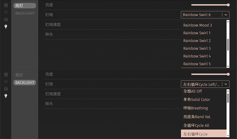 燈效預設的選擇就非常多,從常見的單色、呼吸燈到動態的循環、按壓觸發效果應有盡有,還能隨心所欲調整亮度、速度跟顏色。最特別的是,左右兩側的燈條跟按鍵燈效是可以分開設定的,讓整把鍵盤的視覺變化更有層次,玩出屬於自己的電競氛圍!