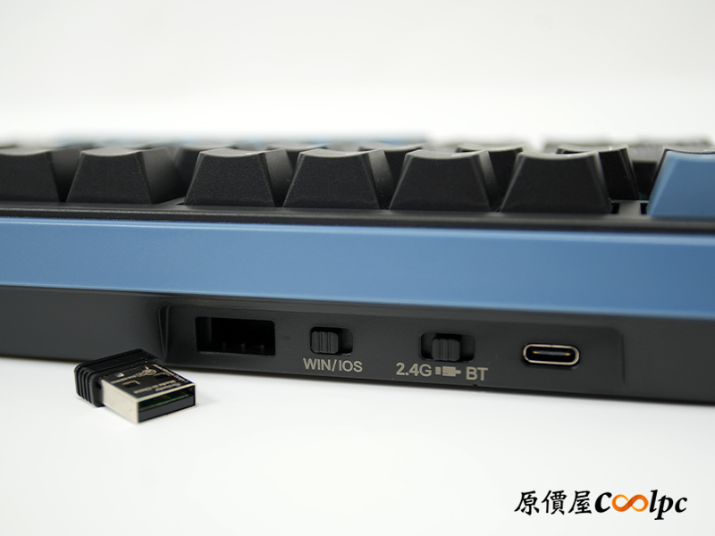 連接埠位於鍵盤左上角,從左至右分別是 USB 接收器的收納埠、WIN / IOS 切換、2.4G / 有線 / BT 切換、USB Type-C 連接埠。