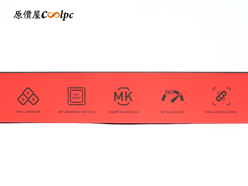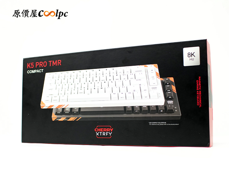 外盒延續了經典的黑紅配色,展現濃厚的 CHERRY 質感與競技風格。左上方醒目的「K5 PRO TMR」與「COMPACT」字樣,直接點出它精悍的 65% 配置;右上方印有的「8K Hz」標籤,更預告了這把鍵盤具備頂級的回報率性能。側邊也貼心地標註了 RGB 燈效、磁軸熱插拔、CHERRY MK 軸體以及自定義動態鍵程等核心規格。