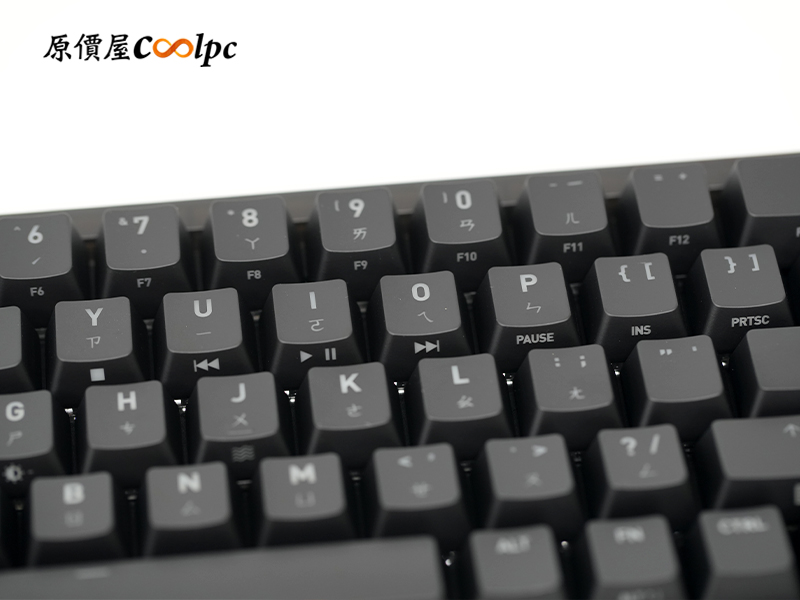從正面看過去真的超級乾淨,只有英文、注音跟數字,視覺上非常清爽。但其實祕密都在側邊,所有的快捷鍵跟 F 鍵都做成側刻,這樣既不影響正面美感,要用的時候低頭看一眼也找得到。另外有個很有趣的功能,這把鍵盤竟然可以模擬滑鼠!按住 Fn 組合鍵就能移動鼠標。小編自己玩了一下,雖然不可能拿來取代真的滑鼠,但如果你正在打字、選字,或是剛好要點一下網頁,手不用特地移開鍵盤就能直接搞定,懶人模式開啟後真的蠻方便的!