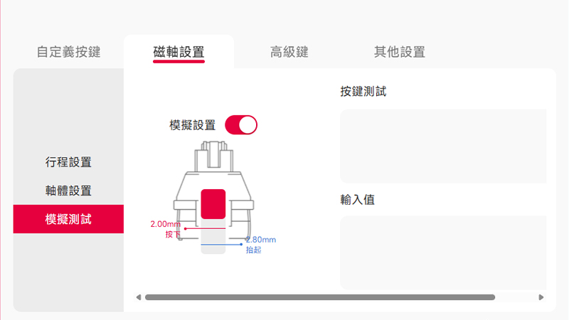 再來看看細項設定,在磁軸設定這區可以自定義按鍵「觸發」跟「結束」的行程。同時,大家最關心的 RT 功能(Rapid Trigger,快速觸發)也是在這邊開啟。不過要注意一下,這兩個功能在設定上會互相影響,所以只能二選一來用唷!