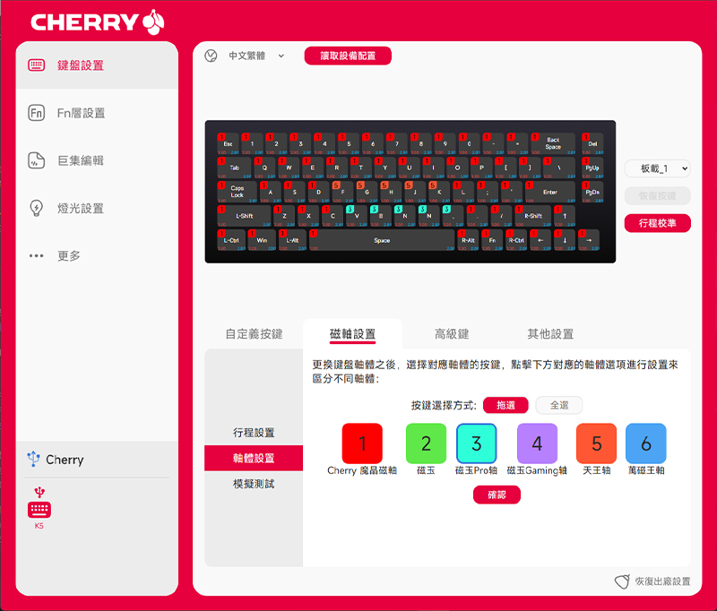 還記得這把鍵盤支援熱插拔嗎!?除了原廠那種絲滑又輕快的「MK 魔晶磁軸」之外,它還能相容磁玉軸、磁玉 Pro、磁玉 Gaming、天王軸、萬磁王軸等,讓你想怎麼混搭就怎麼搭!當然現在市面上的磁軸越來越多,CHERRY 也會隨時更新支援名單,讓大家的選擇更多樣。換好軸體後,只要點一下對應的位置,就能套用不同軸體的設定檔。另外小編再囉唆提醒一次:只要更換過軸體,一定要記得再去校準一遍才會準唷!