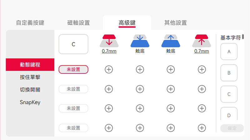 「高級鍵」分頁裡藏了很多厲害的功能,像是動態鍵程(DKS)、按住單擊、切換開關,還有最近超紅的 Snap Tap(SnapKey)。每一種都是不同的觸發方式,不管你是要設定連點、讓不同按壓深度觸發不同指令,還是要玩覆蓋輸入(後鍵蓋前鍵),通通都在這邊調。