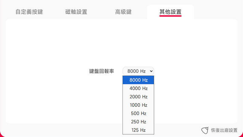 「其他設置」裡則是可以調整輪詢率,最高支援到 8000Hz。對於追求極致性能的玩家來說選最高就對了!